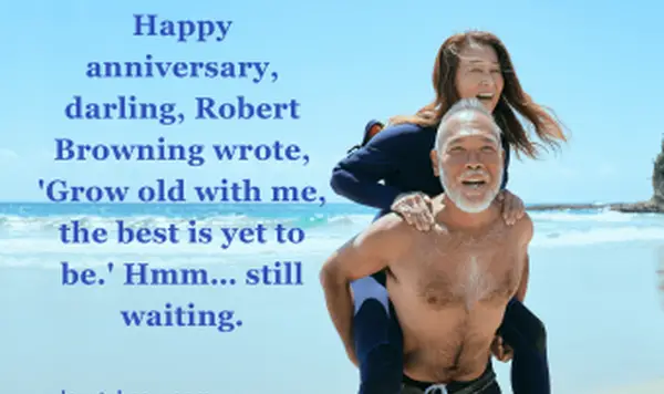 - Buon anniversario, tesoro, Robert Browning ha scritto: 'Invecchia con me, il meglio deve ancora essere'. Hmm... sto ancora aspettando.