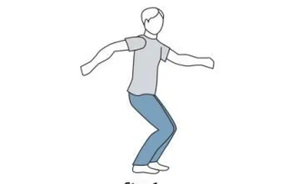 - Salta, atterra con i piedi divaricati e piegati in avanti due volte. Raddrizza e fai oscillare la testa e le braccia RLRL.