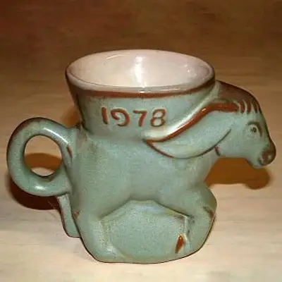Tazze politiche: La maggior parte delle tazze politiche Frankoma viene venduta a $ 15 - $ 35. Le tazze in edizione limitata, come le tazze Ford/Nixon realizzate per la Republican Women's Organization (RWO) sono state vendute fino a $ 800.